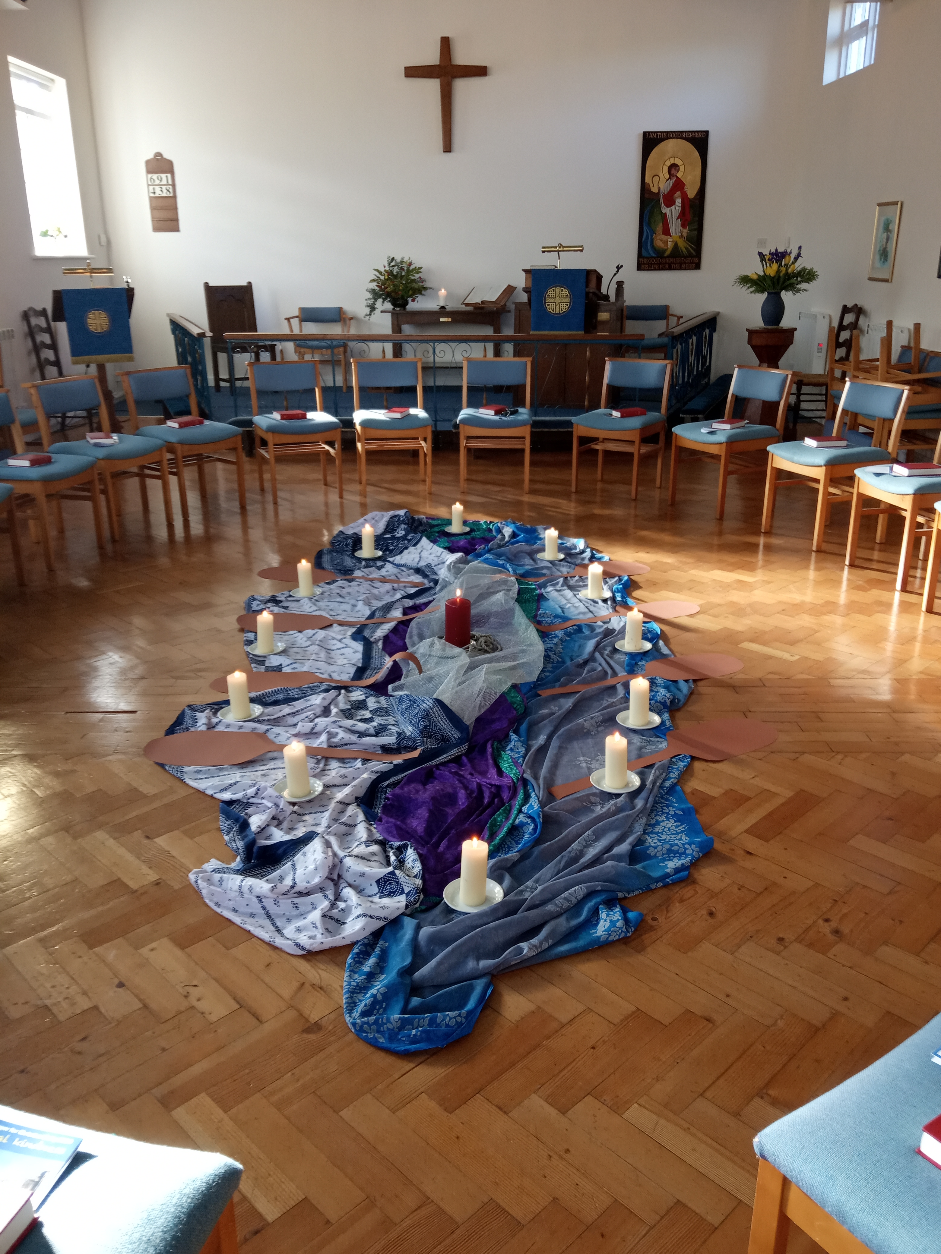 On January 19th the Church in Toft held a service designed by the churches in Malta on the theme of Christian unity. The service, planned and led by Cathy Michell and Barbara Preece, was based on a sea journey taken by St Paul, whose ship was wrecked on the shore of Malta. Once safe on land, the survivors were offered unusual kindness and it was this that formed the main theme of the worship. People were invited to reflect on acts of unexpected kindness they had received in their lives. The centre-piece shown here, reminiscent of a boat at sea, reminded everyone of the perils experienced by refugees today as they attempt, across dangerous waters, to find safety,kindness and a welcome in Britain.